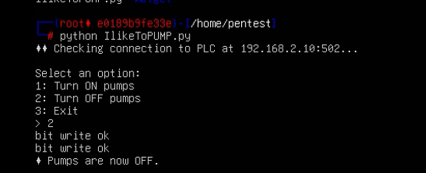 After verifying that mbtget works, it’s time to launch the Python script that interacts with the PLC and simulates a real-world attack by controlling the pumps.