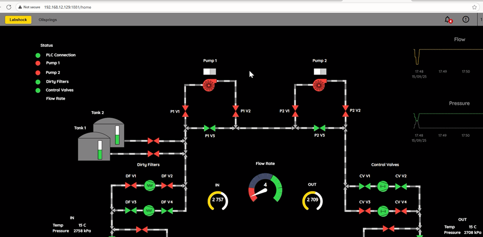 - Verified that the LabShock portal, SCADA dashboard, and PLC interface are all up and running