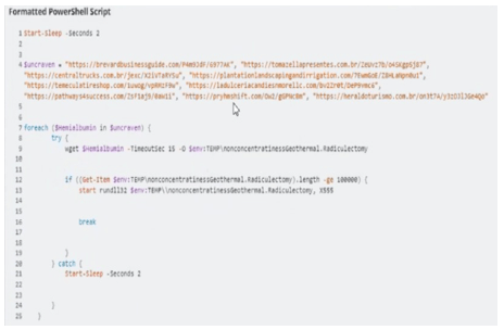 The JScript file didn’t contain readable PowerShell code. Instead, it embedded a Base64‑encoded command and launched PowerShell with it. Once decoded, that command handled the real work — downloading the DLL payload and executing it via rundll32.exe. This hand‑off technique hides the true logic and makes detection harder.