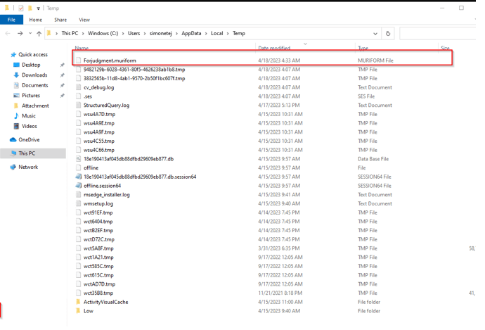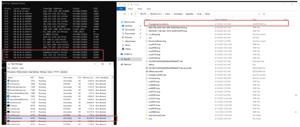 PowerShell downloaded a disguised DLL (forjudgment.muriform) into the Temp directory.