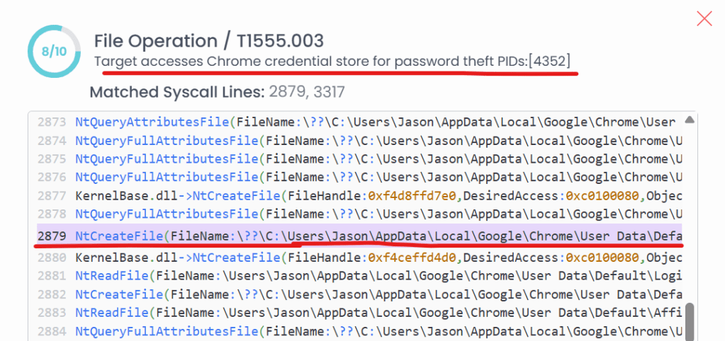 NtCreateFile,NtReadFile,NtQueryInformationFile) targeting Chrome’sUser Data\Defaultdirectory. Files accessed includedLogin Data,Cookies, andFavicons.