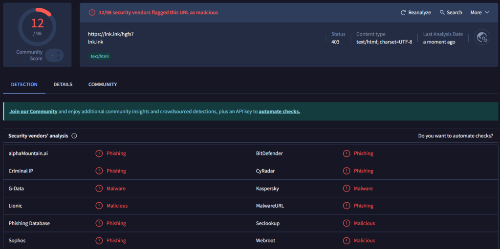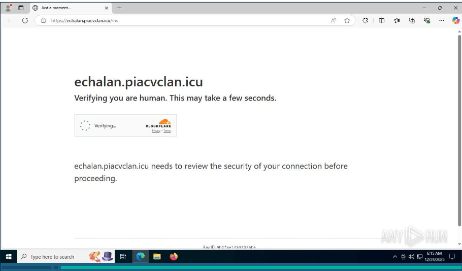 - Android Sandbox (ANY.RUN): The link resolved to a Cloudflare verification page, with no APK delivered during the test. This suggests conditional payload delivery or phishing-only behavior for mobile devices.