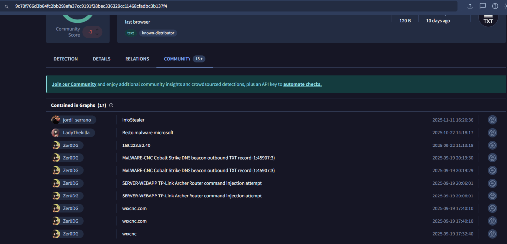 9c70f766d3b84fc2bb298efa37cc9191f28bec336329cc11468cfadbc3b137f4) was flagged on VirusTotal as an InfoStealer and linked to Cobalt Strike DNS beaconing, indicating potential remote access and post-exploitation capabilities.